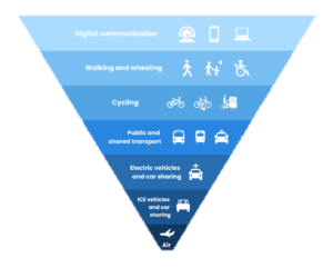 The sustainable travel hierarchy below is quick reference to help you understand where each mode of transport sits in terms of sustainability, with digital communication being the most sustainable and air transport being the least.